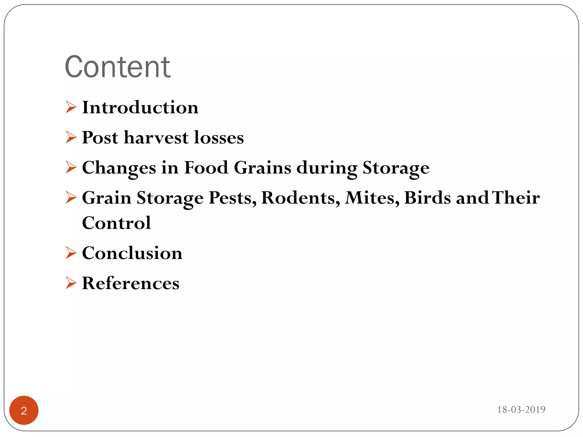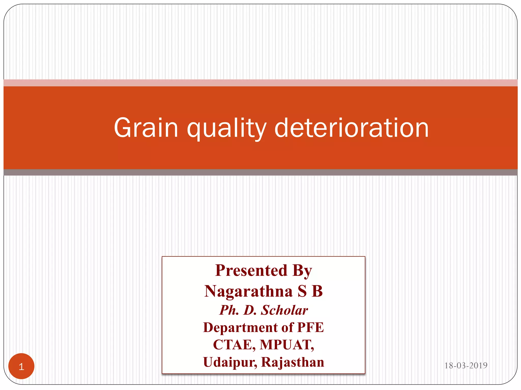 The document discusses grain quality deterioration during storage, emphasizing post-harvest losses and the factors contributing to these changes, including moisture content, temperature, and biological activities from pests and microorganisms. It highlights how improper storage conditions can lead to both quantitative and qualitative losses, affecting grain viability and safety for consumption. The text also outlines the importance of controlling pests and storage conditions to mitigate deterioration and maintain grain quality.
