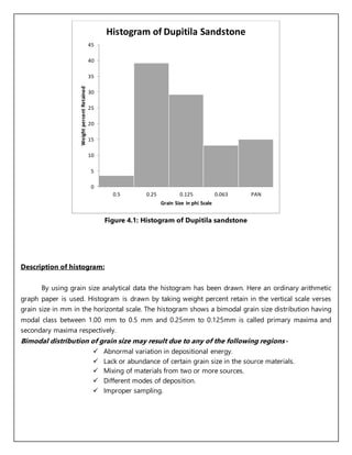 1) Dupitila sandstone - The histogram shows a bimodal distribution with modes between 0.5-1 mm and 0.25-0.125 mm. The median is 0.175 mm. Sorting is well at 2.68 and skewness is finely skewed at 2.21.