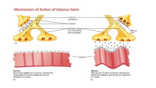 Scientists divide Gram-positive bacilli into spore-forming and non-spore-forming genera. The two spore-forming genera are Bacillus and Clostridium. Bacillus forms endospores centrally and is aerobic. Important pathogenic Bacillus species include B. anthracis and B. cereus. B. anthracis causes anthrax through its toxin and spores. Clostridium forms terminal or subterminal spores and is anaerobic. Important pathogenic Clostridium species are C. perfringens, C. tetani, and C. botulinum, which cause myonecrosis, tetanus, and botulism respectively through their tox