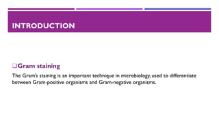 The document outlines the gram staining technique, which differentiates bacteria into gram-positive and gram-negative based on their cell wall composition. Developed by Hans Christian Gram in 1884, the method utilizes specific reagents such as crystal violet, iodine, and safranin to achieve color differentiation. Applications include diagnosing diseases and selecting culture media appropriate for the bacterial type.