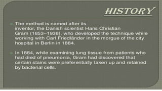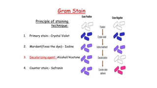 The document outlines the requirements and materials needed for a staining procedure in microbiology. It includes an inoculating loop, Bunsen burner, cotton, microscope, and specific reagents like crystal violet, grams iodine, alcohol, and safranine. These components are essential for performing the staining technique effectively.