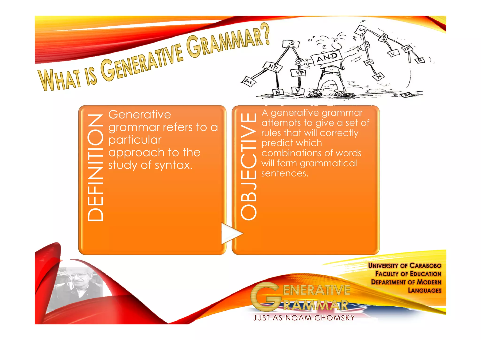Generative grammar, as defined by Noam Chomsky, is a framework for understanding the rules that govern the formation of grammatical sentences. It encompasses various components, including syntax, semantics, and phonology, and introduces concepts like kernel sentences, deep structures, and the minimalist program for language theory. Chomsky's work seeks to describe children's innate knowledge of language and the underlying principles that all human languages share.