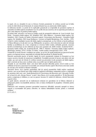 Documentul reprezintă o gramatică a limbii engleze, destinată elevilor și profesorilor, structurată în trei părți principale: morfologia, sintaxa propoziției și sintaxa frazei. Aceasta reunește explicațiile teoretice cu exemple practice, având în vedere atât gramaticile tradiționale românești, cât și progresele recente în studiul limbii engleze. Autoarele își exprima, de asemenea, recunoștința față de colegii care au contribuit la elaborarea lucrării și încurajează sugestiile de îmbunătățire din partea cititorilor.