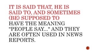 The document discusses the use of passive voice constructions to report information that is said, thought, believed, or expected. It provides examples of transforming active sentences that report what someone says, thinks, or claims into equivalent passive constructions using "it is said/thought/claimed/expected that" or "is said/thought/claimed/expected to".