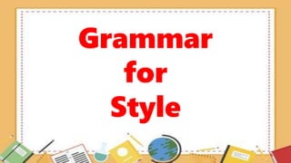 The document covers grammar rules related to style, including common errors related to adjectives, confusing words, dangling modifiers, double negatives, verb tenses, misplaced modifiers, pronoun agreement, and apostrophe usage. It provides examples of incorrect and correct sentence structures to illustrate these concepts. Additionally, it emphasizes the importance of varying sentence structure and includes a final activity to identify errors in a given quote.