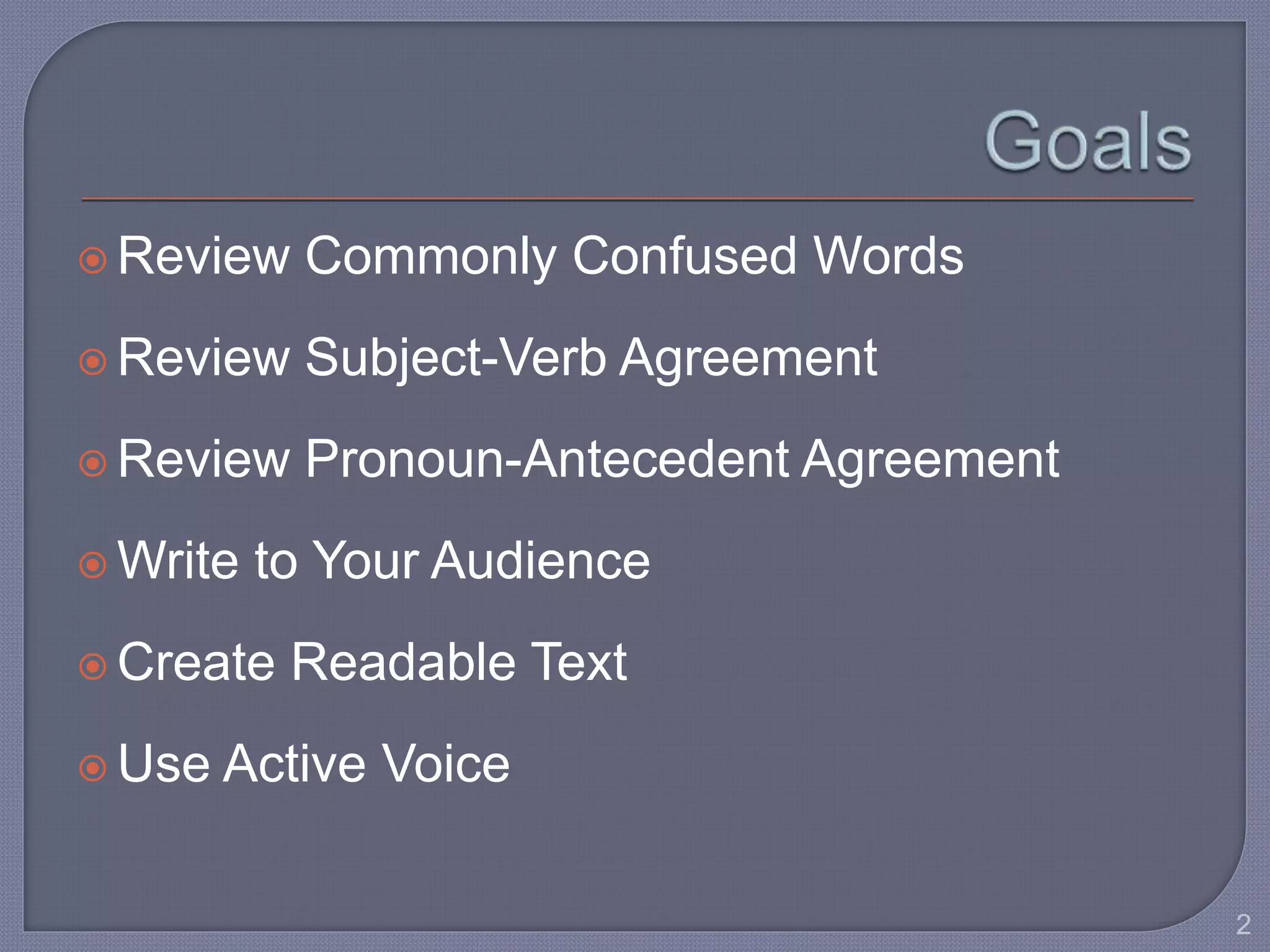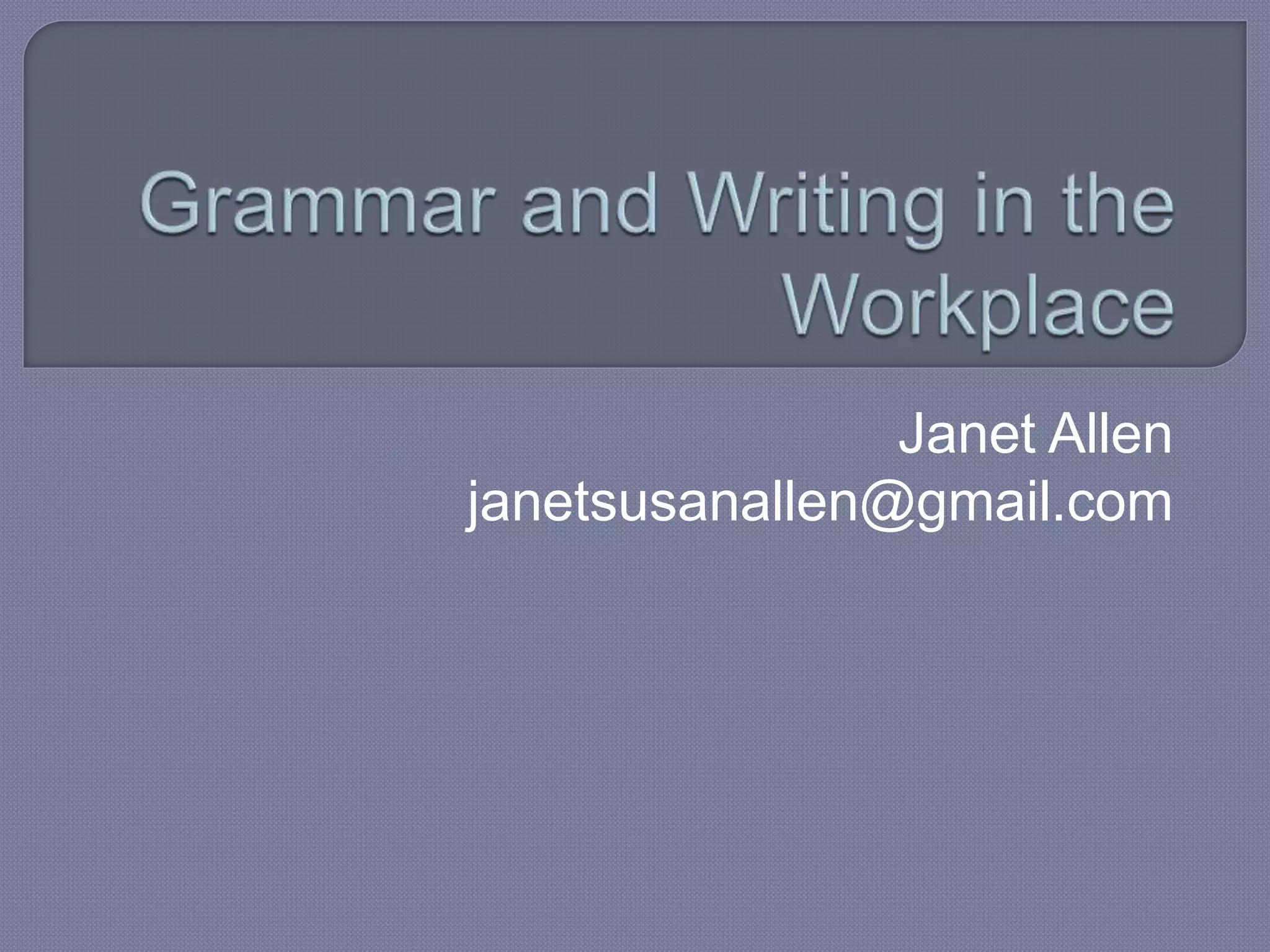 This document provides guidance for improving grammar skills in the workplace. It discusses commonly confused words and their definitions, as well as subject-verb and pronoun-antecedent agreement. Examples are given of homophones, indefinite pronouns, and other grammar topics. Attendees are instructed to participate respectfully and focus on self-improvement. The goal is to help writers enhance credibility, avoid mistakes, and communicate clearly for different audiences and purposes.