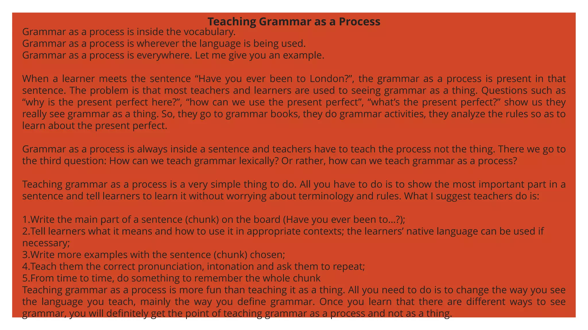 Teaching grammar as a process focuses on grammar within sentences rather than as abstract rules. It involves showing learners the most important parts of sentences, explaining their meanings and uses through examples. The teacher writes sample chunks on the board, tells students what they mean and how to use them, provides more examples, teaches pronunciation and repetition, and periodically reviews. This process-based approach is suggested to be more engaging for learners than traditional rule-based grammar instruction.