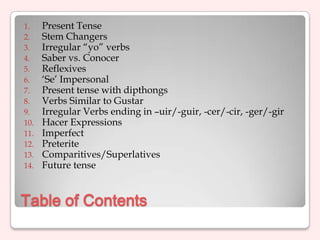 5) Imperfect, preterite, and future tenses along with comparative and superlative structures.