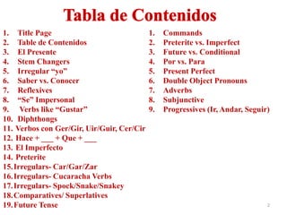 1. Verb conjugations in the present tense for regular -ar, -er, and -ir verbs.
