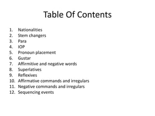 This grammar book contains 12 sections summarizing key Spanish grammar topics including: 1) nationalities, 2) stem-changing verbs, 3) para, 4) indirect object pronouns, 5) pronoun placement, 6) gustar, 7) affirmative and negative words, 8) superlatives, 9) reflexives, 10) affirmative commands and irregular verbs, 11) negative commands and irregular verbs, and 12) sequencing events. Each section provides explanations, examples, and conjugations of related grammar structures.