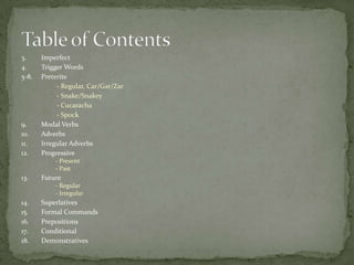 It also includes tables and examples for conjugating verbs in different tenses, moods, and with various grammatical structures.