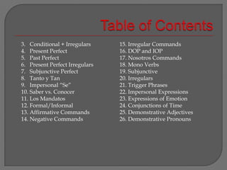 This document provides an outline for the contents of a grammar book for the second semester. It includes sections on topics like the conditional and irregular verbs, various tenses like the present perfect and past perfect, commands, subjunctive mood, impersonal "se", conjunctions, and more. Each section provides a brief overview of the topic covered in 2-3 sentences.