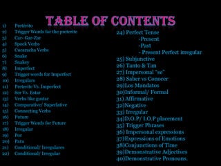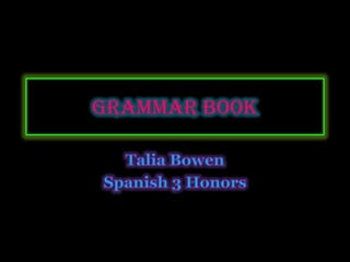 This document provides a grammar reference guide for Spanish 3 Honors. It includes sections on verb tenses and moods such as preterite, imperfect, future, conditional, and subjunctive. It also covers topics like stem-changing verbs, por vs para, saber vs conocer, commands, and more. Trigger words, irregular verbs, and examples are provided for each grammar concept. The document concludes with sections on impersonal expressions, conjunctions of time, and demonstrative adjectives and pronouns.