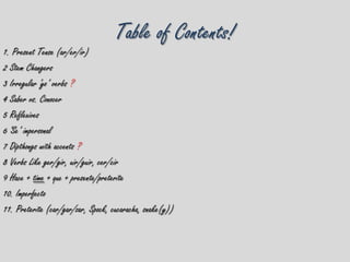 This document contains an outline for a Spanish grammar book. It lists and briefly describes 12 grammar topics: present tense verbs, stem changers, irregular "yo" verbs, saber vs conocer, reflexives, "se" impersonal, diphthongs with accents, verbs like ger/gir and uir/guir, hace + time + que + present/preterite, imperfect tense, and preterite tense for different verb types. The outline provides the chapter structure and headings to explain Spanish verb conjugations and other grammar concepts.