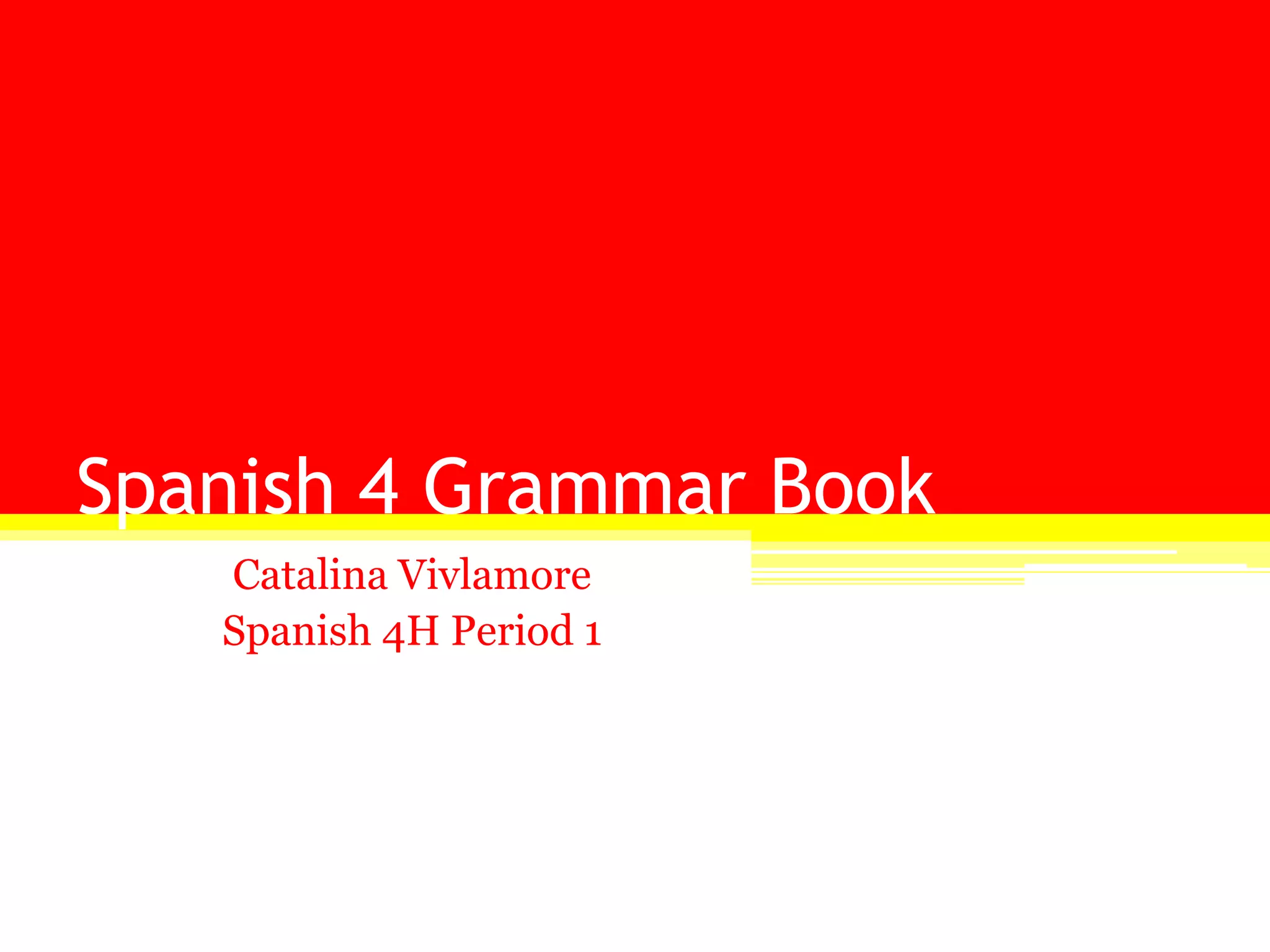 This document provides a table of contents for a Spanish 4 grammar book. The table of contents lists 37 chapters covering various Spanish grammar topics like verb tenses (present, preterite, imperfect), uses of ser and estar, gustar and similar verbs, object pronouns, subjunctive mood, commands, and prepositions. Each chapter title is accompanied by the page numbers for that chapter.