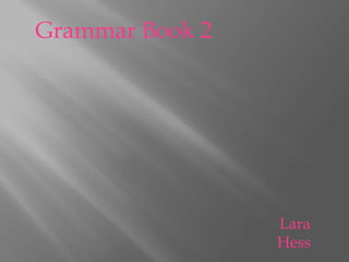 This document contains an outline for Grammar Book 2. It includes 16 sections covering grammar topics like the imperfect, preterite, stem changers, modal verbs, adverbs, present/past progressive, future/irregular future, superlatives, commands, prepositions, and demonstratives. Each section provides examples and explanations of the grammar concepts covered in that section.