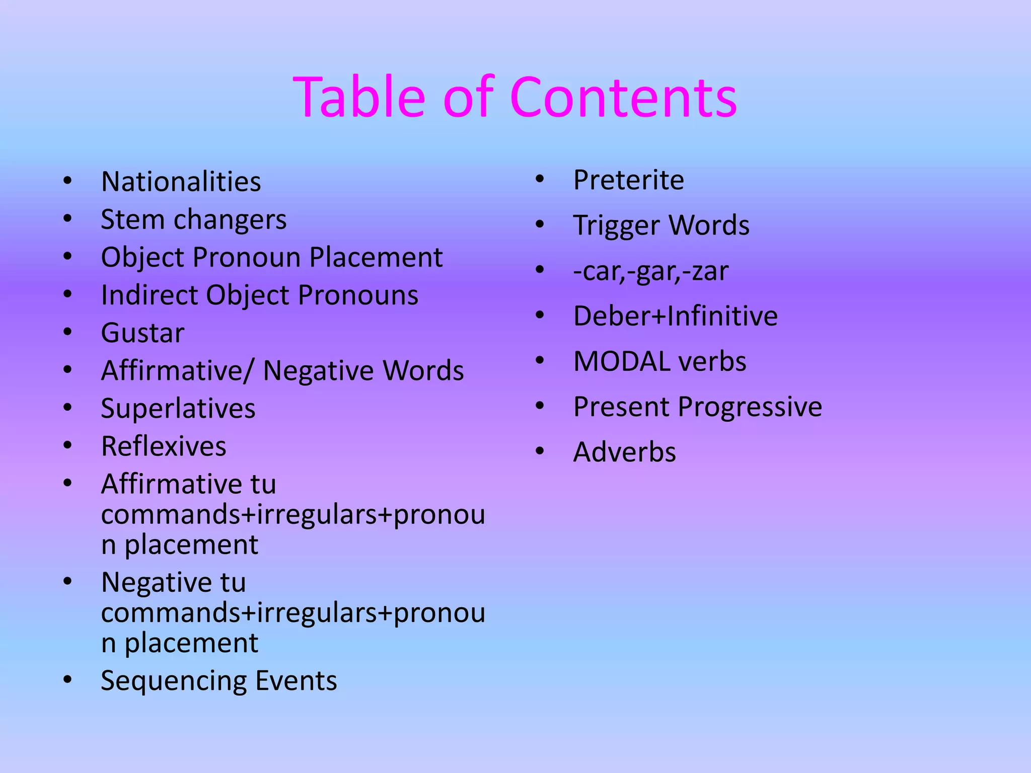 This grammar book covers many Spanish grammar topics in 3 sentences or less including: stem changers, pronoun placement, indirect object pronouns, gustar, affirmative and negative words, superlatives, reflexives, commands, sequencing events, the preterite, trigger words, -car -gar -zar verbs, deber + infinitive, modal verbs, the present progressive, and adverbs.