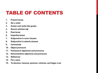 This document is a table of contents for a Spanish grammar book. It lists 16 chapters covering topics like the present tense, ser vs estar, gustar verbs, nouns and articles, past and imperfect tenses, subjunctive mood, commands, pronouns and more. For each chapter it provides a brief overview of the key concepts and examples to illustrate grammar points.