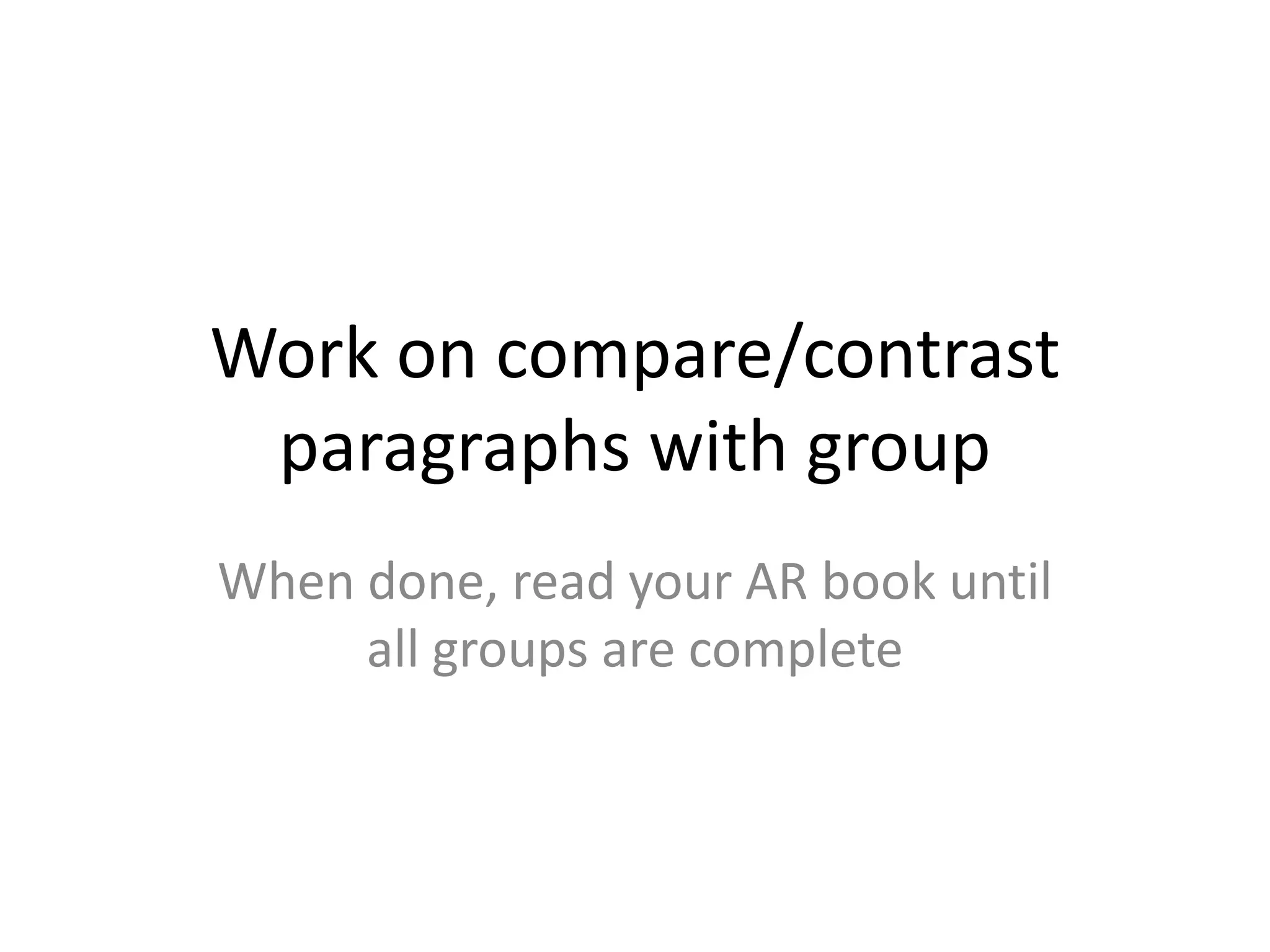Work on compare/contrast paragraphs with a group. When finished, read independently until all groups are done. Then diagram five example sentences identifying subjects, verbs, objects, and other parts of speech. Finally, create a grammar dictionary defining common parts of speech like subjects, verbs, objects, adjectives, and adverbs with examples.