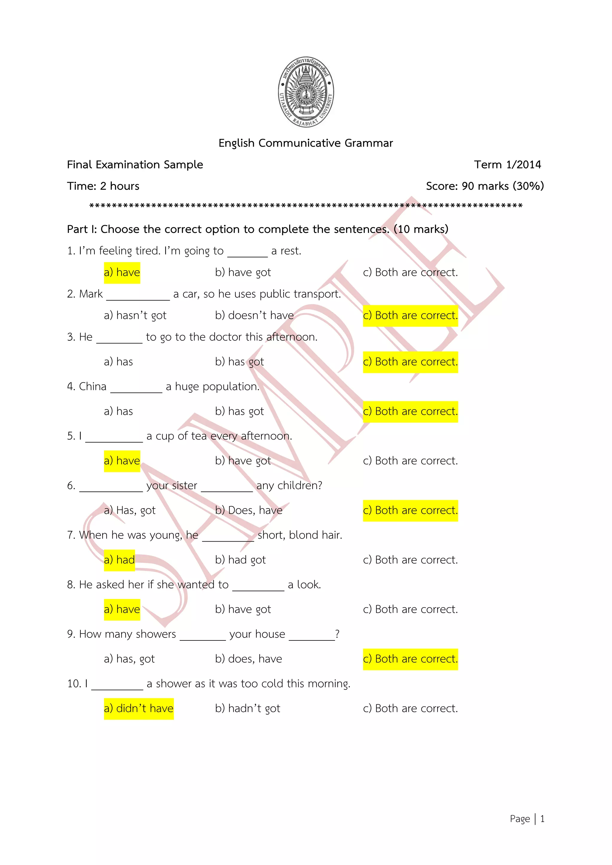 The document contains an English grammar exam with multiple choice and fill-in-the-blank questions testing the use of verbs, conditionals, relative pronouns/adverbs, and reported speech. It also includes exercises requiring the student to transform sentences between active and passive voice and combine sentences using relative clauses. The exam tests a wide range of English grammar concepts over 90 marks divided into 7 sections.