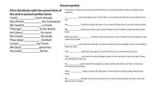 The document provides exercises for practicing the present perfect and simple past tenses of verbs. It includes fill-in-the-blank, sentence rewriting, and multiple-choice questions, along with an answer key. The aim is to reinforce grammatical understanding and usage of these tenses.