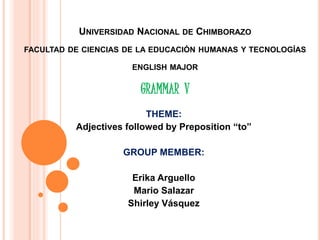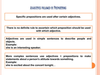 This document discusses the use of adjectives followed by the preposition "to". It provides examples of common adjective-preposition combinations using "to", such as similar to, dedicated to, loyal to, and married to. It notes that certain adjectives can take different prepositions depending on whether the subject is impersonal or personal. The document also includes an activity that tests the reader's knowledge of choosing the correct adjective-preposition combination in sentences.
