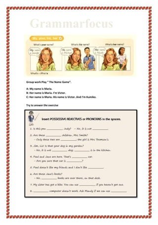 The students played a name game where they took turns introducing themselves and repeating the names of those who previously introduced themselves, with each subsequent student adding their own name to the end of the repeated names. They practiced introducing themselves and remembering multiple names in a group setting.