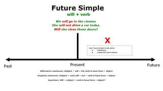 The document explains the usage of the future simple tense with 'will' for various scenarios such as predictions, unplanned actions, wishes, promises, offers, and requests. It provides examples and emphasizes how to structure sentences using 'will' and its contractions. Additionally, it highlights the verb 'be' in relation to adjectives and adverbs within future simple constructions.