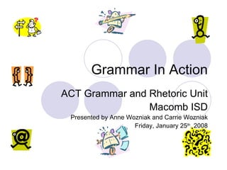 The document provides an overview of a grammar and rhetoric unit for ACT preparation presented by Anne and Carrie Wozniak. It outlines the unit's organization, which is based on ACT College Readiness Standards and includes test samples, additional grammar support, and classroom activities like cut and paste exercises, online practice, and scanning activities. The unit aims to help students with the English, writing, and social studies sections that make up most of the ACT score.