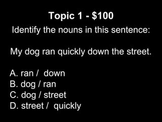 This document contains a quiz about parts of speech including nouns, verbs, adjectives, pronouns, and adverbs. It is organized into 5 topics with 5 questions each about identifying examples of each part of speech in sentences. For each question, the participant selects the correct answer and is awarded a corresponding monetary amount ranging from $100 to $500.