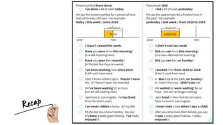 The document provides guidance on distinguishing between the present perfect and past simple tenses. It includes examples and exercises to practice using both forms in sentences, emphasizing the importance of context when choosing between them. Additionally, it invites readers to reach out via email with any questions.