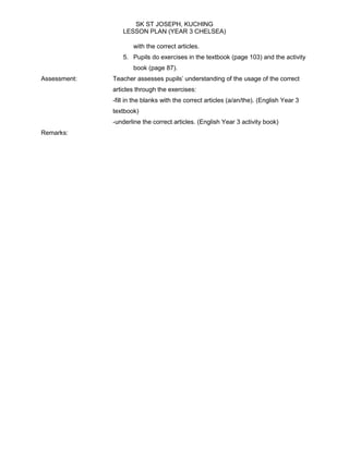 This document outlines a lesson plan for an English class on articles (a, an, the) for Year 3 students. The lesson plan includes the objectives, which are for students to correctly fill in blanks with articles, as well as activities such as watching a video on articles, teacher explanation of articles, reading sentences aloud for students to identify articles, and students completing exercises in textbooks and workbooks to practice using articles. The lesson will be assessed based on students' ability to fill in blanks with correct articles in exercises.