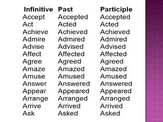 - Regular verbs follow a consistent pattern of adding "-ed" for the past tense and past participle, while irregular verbs do not follow a consistent pattern.
