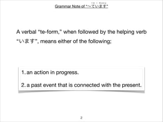 3. Examples are given of common verbs used with "~te imasu" to express things like possessions, knowledge, physical attributes, clothing, residence, and employment. Verbs of motion like "ikimasu" indicate a current location when used with