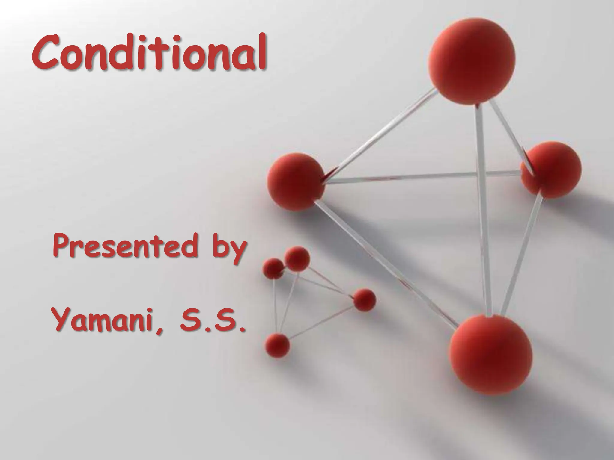 The document discusses three types of conditional sentences in English: real present conditional, unreal present conditional, and unreal past conditional. The real present conditional refers to possible future events, the unreal present conditional refers to unlikely present situations, and the unreal past conditional refers to impossible past events. Each type of conditional sentence has a specific grammatical structure and usage to indicate likelihood or possibility.
