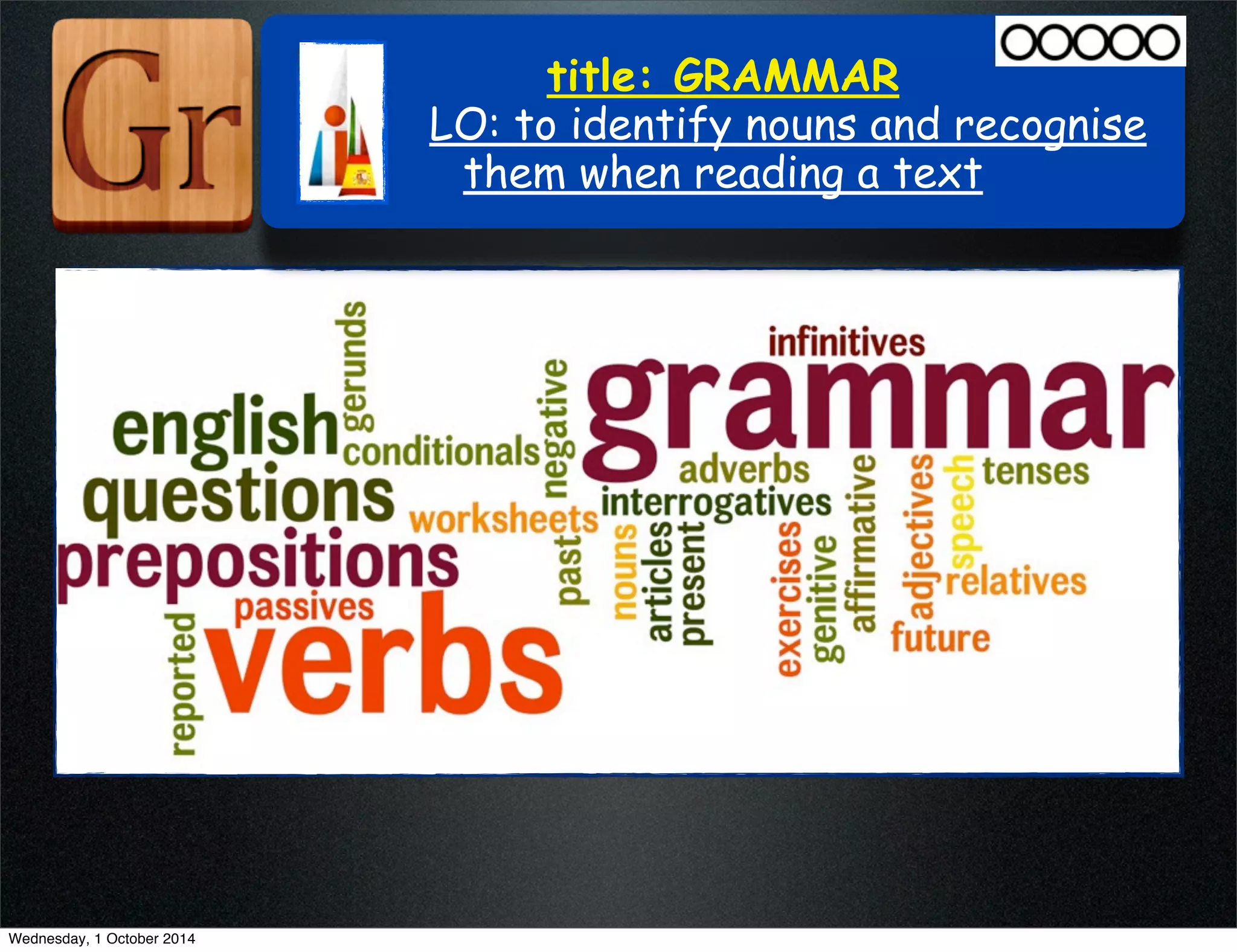 This document provides information about grammar lessons focused on nouns. It begins with an introduction to grammar and identifying nouns. Several exercises are included to practice identifying nouns, such as underlining nouns in sentences and touching shoulders to indicate nouns vs. non-nouns heard in a listening activity. Types of nouns like proper, concrete, and abstract are defined. Lessons also cover singular and plural nouns, including rules for making nouns plural in English, French, Spanish, and Italian. Converting nouns between singular and plural forms is practiced. Finally, articles (definite and indefinite) and gender of nouns are discussed with examples.