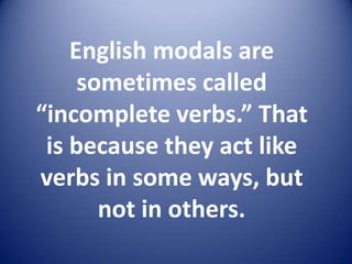 Modals are verbs that are considered "incomplete" because they act partly like verbs but not completely. There are core modals like shall, should, will, would, may, might, can, could that are followed by the base form of other verbs and don't take -s in the third person singular. Modals have similar meanings to expressions like "have to", "be supposed to", "be allowed to", and "ought to". Modals can be tricky because their meanings change in the negative and past tense forms.