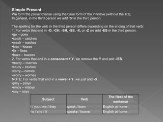 The document discusses the verb "to be" which is used to describe people, things, and locations. It has three conjugations: am, is, and are. Examples of usage are provided for the different subjects and forms.