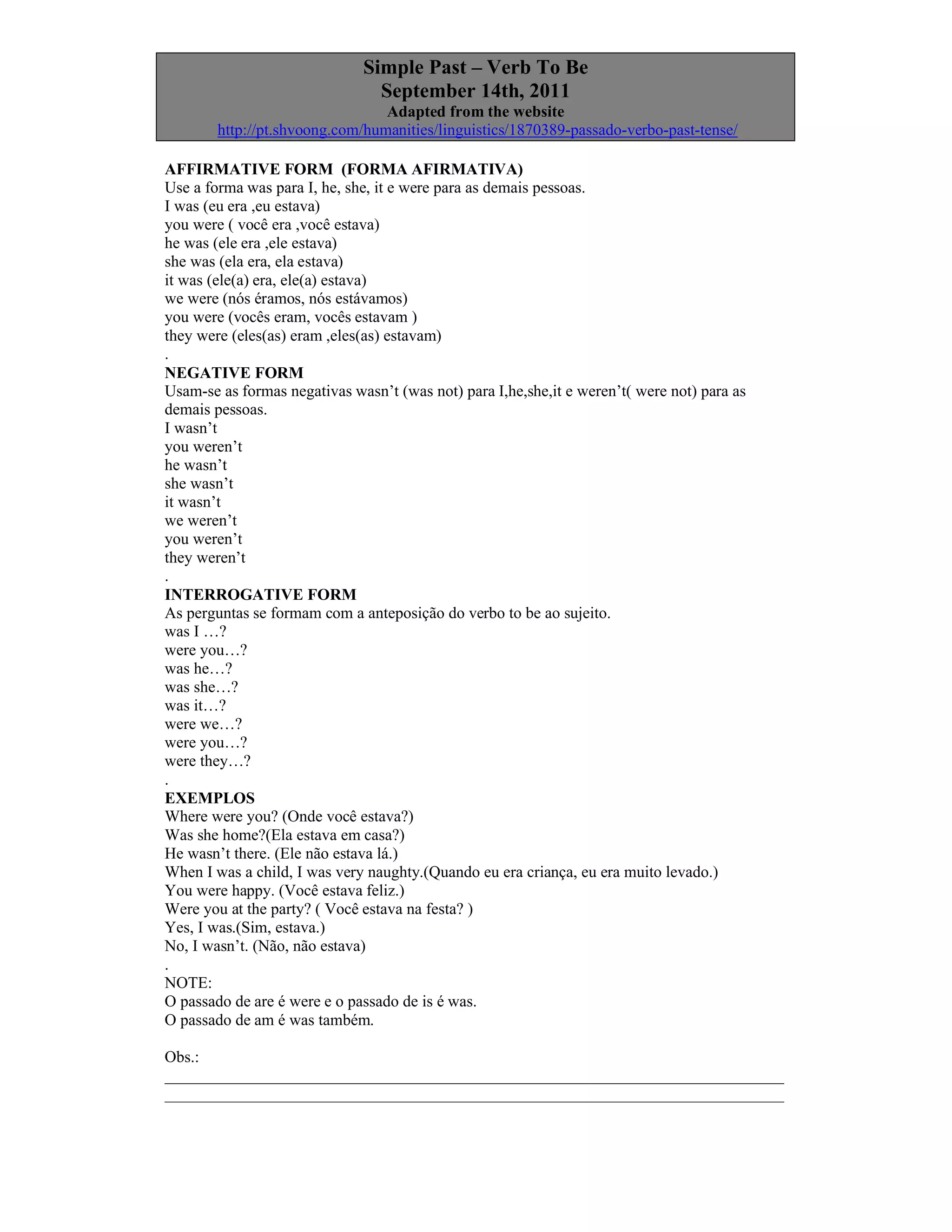 The document discusses the simple past tense of the verb "to be" in English. It provides the affirmative, negative, and interrogative forms of the verb for each subject pronoun. The affirmative form uses "was" for I, he, she, it and "were" for all other subjects. The negative form uses "wasn't" and "weren't". Questions are formed by placing the verb before the subject. Examples are given to illustrate the different forms and uses.