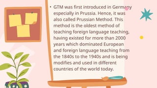 The Grammar Translation Method (GTM) is an older language teaching approach that emphasizes translating sentences between the native and target languages, first introduced in Germany and popular from the 1840s to 1940s. While it focuses on grammar rules and reading/writing skills, it is criticized for leading to low student motivation and poor pronunciation, as it lacks interactive elements and conversational skill development. Many believe that despite some advantages in understanding grammar and sentence structure, the method ultimately hampers effective communication in the target language.