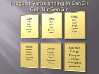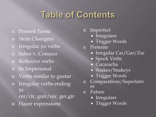 The document provides an overview of key grammatical concepts in Spanish, including:
