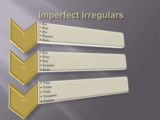 - Verb tenses like the present, preterite, imperfect, and future tenses.
