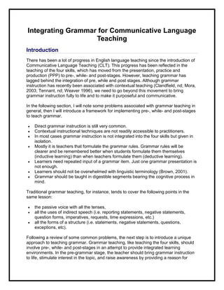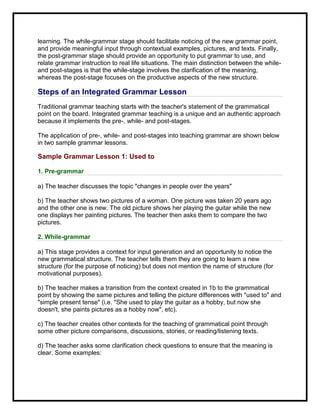 This document discusses integrating grammar instruction into communicative language teaching using a pre-, while-, and post-stage framework. It notes problems with traditional grammar teaching such as being taught in isolation rather than integrated into skills. A sample grammar lesson on "used to" is provided as an example of this framework, with the pre-stage stimulating interest, the while-stage providing contextual examples and noticing the structure, and the post-stage applying it communicatively. The framework aims to make grammar purposeful and integrated into real-world language use.
