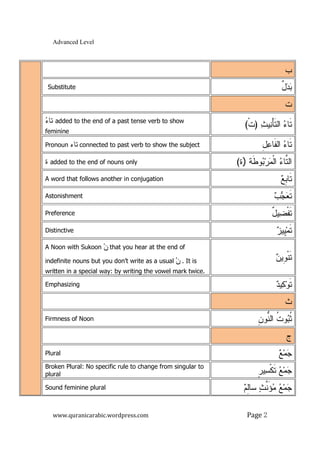 The document provides definitions for various grammatical terms in Arabic. It defines different types of nouns like definite nouns, verbal nouns, nouns after prepositions. It also defines parts of speech like verbs, pronouns, prepositions. Additionally, it covers grammatical concepts like plural forms, sentences structures, and particles that affect grammar rules. The document serves as a reference for students to understand key terms used in Arabic grammar.