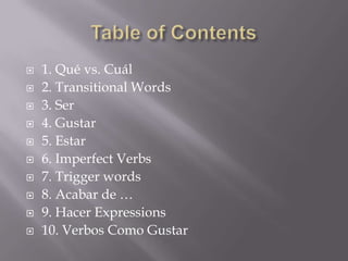 The document provides an overview of key grammatical concepts in Spanish, including the differences between qué and cuál, common transitional words, uses of ser and estar, imperfect verbs, trigger words for imperfect tense, expressions using acabar de and hacer, and examples of verbs like gustar. It covers topics such as descriptions, relationships, locations, and emotions. Verb conjugations and commands are also reviewed. The document serves as a reference for basic Spanish grammar structures.
