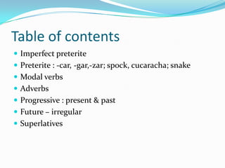 The document provides an overview of Spanish grammar topics including: