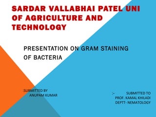 This document discusses Gram staining of bacteria. Gram staining is an important differential staining technique that classifies bacteria into two groups - Gram positive and Gram negative - based on their cell wall structure. Gram positive bacteria appear violet after Gram staining due to their thick peptidoglycan layer retaining the crystal violet dye, while Gram negative bacteria appear red as their thinner peptidoglycan layer is decolorized, revealing the safranin counterstain. The document outlines the reagents, steps, and expected colors of the Gram staining procedure and compares the cell wall structures of Gram positive and Gram negative bacteria.