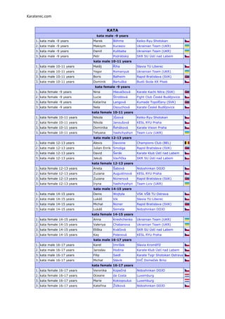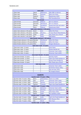 The document appears to be results from a karate tournament listing winners in various age categories and weight classes for both kata (forms) and kumite (sparring) competitions. The winners are listed with their name, country/club, and ranking. Categories included male and female divisions for ages -9, 10-11, 12-13, 14-15, 16-17, veterans, and teams. It provides a overview of the tournament results across multiple age/gender/weight classes in both kata and kumite events.