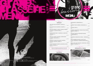 (7) ham and eggs so šunkou a vajcom (3) 150/120 g . . . . . . . . . . . . . . . . . . . . . . . . . . . . . . . . . . . . . 3,30 € bac and eggs so slaninou a vajcom (3) 150/120 g . . . . . . . . . . . . . . . . . . . . . . . . . . . . . . . . . . . . . 3,50 € anglické raňajky s tomat. fazuľou, parkom, slaninou a volským okom (3) 200/50 g. . . . . . . . . . . . . . . . . . . . . . . . . . . . . . . . . . . . . . 3,80 € frankfurtské párky s horčicou a čerstvým chrenom (1,11) 0,33 l. . . . . . . . . . . . . . . . . . . . . . . . . . . . . . . . . . . . . . . . . 1,60 € hovädzí vývar s mäsom a rezancami (9) 0,33l . . . . . . . . . . . . . . . . . . . . . . . . . . . . . . . . . . . . . . . . . 1,60 € knoodel suppe (1) 0,33l . . . . . . . . . . . . . . . . . . . . . . . . . . . . . . . . . . . . . . . . . 2,00 € talianska cesnaková s prosciutom, šunkou, vajcom a syrom (1,7) 0,33l . . . . . . . . . . . . . . . . . . . . . . . . . . . . . . . . . . . . . . . . . 3,10 € tekvicový krém so strateným vajcom a parmezánom (3) 150/120 g . . . . . . . . . . . . . . . . . . . . . . . . . . . . . . . . . . . . 4,00 € 0,33l . . . . . . . . . . . . . . . . . . . . . . . . . . . . . . . . . . . . . . . . . 2,80 € omeleta s pikant. salámou, hermelínom a cherry paradajkami (3) francúzka cibuľová so syrom – zapekaná (7,1) 230/120 g. . . . . . . . . . . . . . . . . . . . . . . . . . . . . . . . . . . . 4,00 € raňajkový tanier so šunkou, salámou, eidamom, maslom a jamom (7) 150/120 g . . . . . . . . . . . . . . . . . . . . . . . . . . . . . . . . . . . . . 3,50 € sladký raňajkový tanier s jogurtom, musli, jamom a maslom (7) 0,40l. . . . . . . . . . . . . . . . . . . . . . . . . . . . . . . . . . . . . . . . . 3,10 € veľká hovädzia polievka „asia style“ s hov. sviečkovou a ryžovými rezancami (6) 0,40l. . . . . . . . . . . . . . . . . . . . . . . . . . . . . . . . . . . . . . . . . 5,00 € veľká „tom yum“ polievka s krevetami, hubami, pórom a cibuľkou (2,11) 0,40l. . . . . . . . . . . . . . . . . . . . . . . . . . . . . . . . . . . . . . . . . 5,00 € 100/120 g. . . . . . . . . . . . . . . . . . . . . . . . . . . . . . . . . . . . . 2,50 € raňajky sú podávané s pečivom do 10.30 hod. jedlá cez víkend podávame už od 9.00 hod predjedlá a tapas polievky grand caffe caffe cocktail bar & restaurant wi – fi free visa mastercard maestro american express diners club ceny platné: od 1.12 .2010 coffee touch s.r.o zodp. vedúci zodp. vedúci i. melničáková, sládkovičova 1, 01001 žilina www.grandcaffe.sk info@grandcaffe.sk tel.: +421 041 56 22 378 carpacio clasico s hov. sviečkovou, olivami a parmezánom (7) 100 g. . . . . . . . . . . . . . . . . . . . . . . . . . . . . . . . . . . . . . . . 4,50 € . grand caffe caffe cocktail bar & restaurant