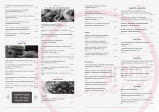 mozzarelou (7) 200 g . . . . . . . . . . . . . . . . . . . . . . . . . . . . . . . . . . . . . . . . 3,50 € balkánska nátierka s feta syrom a zeleninovými chipsami (7) šalát ako hlavné jedlo rizoto beef s hov. sviečkovou, suš. paradajkami, mrkvou a syrom pecorino (7) 400g. . . . . . . . . . . . . . . . . . . . . . . . . . . . . . . . . . . . . . . . . 6,80 € prosciuto-rucola s fetou, capari a limetou (1,7) 80 g. . . . . . . . . . . . . . . . . . . . . . . . . . . . . . . . . . . . . . . . . . 4,30 € rizoto hydinové alebo vegetariana so zeleninou, šafránom, tofu/kuracím (7) 400g . . . . . . . . . . . . . . . . . . . . . . . . . . . . . . . . . . . . . . . . 6,40 € arabský s hydinovým špízom a jogurtovo-mätovým dresingom (7) tapas „cripsy polo“ s vyprážanými kur. prsiami a pikant. majonézou (1) 400g. . . . . . . . . . . . . . . . . . . . . . . . . . . . . . . . . . . . . . . . . 5,90 € 100 g. . . . . . . . . . . . . . . . . . . . . . . . . . . . . . . . . . . . . . . . . 3,30 € 400g. . . . . . . . . . . . . . . . . . . . . . . . . . . . . . . . . . . . . . . . . 6,30 € tapas beef fajitas s hov. sviečkovou a zeleninou (11) 400g. . . . . . . . . . . . . . . . . . . . . . . . . . . . . . . . . . . . . . . . 5,80 € vegetariana so cherry paradajkami, šampiónmi a mozzarelou (1,7) orzoto s kuriatkami, kuracími prsiami, smotanou a parmezánom (7) 370g . . . . . . . . . . . . . . . . . . . . . . . . . . . . . . . . . . . . . . . . . 5,90 € mediterane s krevetami, cherry paradajkami a chillidresingom (2,7) burgers 400g. . . . . . . . . . . . . . . . . . . . . . . . . . . . . . . . . . . . . . . . . 6,20 € orzoto tekvicové s kuracími prsiami plnenými syrom pecorino (7) ceasar s kuracím, parmez. a krutónmi (7,10) penne 400g. . . . . . . . . . . . . . . . . . . . . . . . . . . . . . . . . . . . . . . . . 6,50 € 400g. . . . . . . . . . . . . . . . . . . . . . . . . . . . . . . . . . . . . . . . . 6,50 € vergine s kur. prsiami, kukuricou, smotanou a parmezánom (1,7) rucola beef s hov. sviečkovou a cherry paradajkami 100 g. . . . . . . . . . . . . . . . . . . . . . . . . . . . . . . . . . . . . . . . . 5,50 € rizoto, orzoto 350g . . . . . . . . . . . . . . . . . . . . . . . . . . . . . . . . . . . . . . . . . 6,30 € tapas „ picarda“ s br. panenkou, mandľami a petržlenom (5) 80 g. . . . . . . . . . . . . . . . . . . . . . . . . . . . . . . . . . . . . . . . . . 4,30 € 400g . . . . . . . . . . . . . . . . . . . . . . . . . . . . . . . . . . . . . . . . 5,90 € vongole so slávkami a drtnenými paradajkami (1,14) 200 g . . . . . . . . . . . . . . . . . . . . . . . . . . . . . . . . . . . . . . . . 3,30 € tapas „gambas“ s krevetami, chilli a olivovým olejom (2) bolognese s mäsovou zmesou a parmezánom (1,7) maiale s bravčovou panenkou, pomodoro a syrom pecorino (1,7) 350g . . . . . . . . . . . . . . . . . . . . . . . . . . . . . . . . . . . . . . . . . 6,90 € fitnes s hydinovým špízom a syrom eidam 400g. . . . . . . . . . . . . . . . . . . . . . . . . . . . . . . . . . . . . . . . . 5,50 € francúzky so steakom tunafish, fazuľkami a zemiakmi (4) 400g. . . . . . . . . . . . . . . . . . . . . . . . . . . . . . . . . . . . . . . . . 5,90 € 400g . . . . . . . . . . . . . . . . . . . . . . . . . . . . . . . . . . . . . . . . 5,90 € giana s kuracími prsiami nivou, smotanou a šampiónmi (1,7) 400g. . . . . . . . . . . . . . . . . . . . . . . . . . . . . . . . . . . . . . . . . 6,20 € 400g. . . . . . . . . . . . . . . . . . . . . . . . . . . . . . . . . . . . . . . . . 7,70 € puttanesca s ančovičkami, olivami, capari a cherry paradajkami (1) grécky s bravčovým špízom a pitou, tzadziky (7) halušky s kyslou smotanou, bravčovou panenkou a slaninou (1,7) (400g){1,7. . . . . . . . . . . . . . . . . . . . . . . . . . . . . . . . . . . . . 6,30 € s morčacím ragú s kuriatkami na tymiáne a smotanou (1,7) (400g){1,7. . . . . . . . . . . . . . . . . . . . . . . . . . . . . . . . . . . . . 6,30 € 400g. . . . . . . . . . . . . . . . . . . . . . . . . . . . . . . . . . . . . . . . . 5,90 € noodle 400g. . . . . . . . . . . . . . . . . . . . . . . . . . . . . . . . . . . . . . . . . 6,60 € beef burger, steak hranolky, ketchup (1,7) (290/100/30g). . . . . . . . . . . . . . . . . . . . . . . . . . . . . . . . . 6,80 € big fat burger s volským okom, steak hranolky, ketchup (1,3,7) (320/100/30g). . . . . . . . . . . . . . . . . . . . . . . . . . . . . . . . . 7,20 € grill s marinovaným hermelínom a zeleninou na grile (7) 400g. . . . . . . . . . . . . . . . . . . . . . . . . . . . . . . . . . . . . . . . . 5,40 € kleopatra s avocadom, kuracími prsiami a parmezánom (7) chilli burger s jalapeňo, steak hranolky, ketchup (1,7) 400g. . . . . . . . . . . . . . . . . . . . . . . . . . . . . . . . . . . . . . . . . 6,20 € (280/100/30g). . . . . . . . . . . . . . . . . . . . . . . . . . . . . . . . . 6,80 € 400g. . . . . . . . . . . . . . . . . . . . . . . . . . . . . . . . . . . . . . . . 5,40 € bosco s vypr. enciánom a brusnicami (1,7) chicken burger, steak hranolky, ketchup (1,7) cestoviny (280/100/30g). . . . . . . . . . . . . . . . . . . . . . . . . . . . . . . . . 6,50 € veget burger, steak hranolky, ketchup (1,7) chicken chines s kuracími prsiami, zeleninou, sójovou omáčkou a sezamom (1,6,11) tagliatelle s kačacími prsiami, korením,bielym vínom, smotanou a pecorinom (1,7) 400g. . . . . . . . . . . . . . . . . . . . . . . . . . . . . . . . . . . . . . . . . 6,90 € porcino con polo s hríbami, kuracími prsiami, petržlenom a parmezánom (1,7) 400g. . . . . . . . . . . . . . . . . . . . . . . . . . . . . . . . . . . . . . . . . 6,20 € beef „hong kong“ s hovädzou sviečkovou, zeleninou a oyster sauce (1,6,11,14) 400g . . . . . . . . . . . . . . . . . . . . . . . . . . . . . . . . . . . . . . . . 6,90 € vegetariana s tofu, zeleninou, ustricovou omáčkou a sezamom (1,6,7,11) 400g. . .